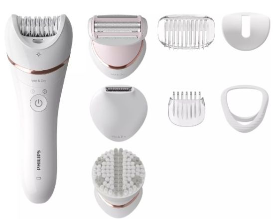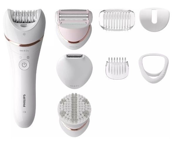 эпилятор, бикини-триммер с гребнем, бритвенная головка, насадка для оптимального контакта, насадка для пилинга тела, насадка для чувствительных участков, насадка-гребень, насадка-триммер для линии бикини, чехол, щеточка для чистки, зарядное устройство