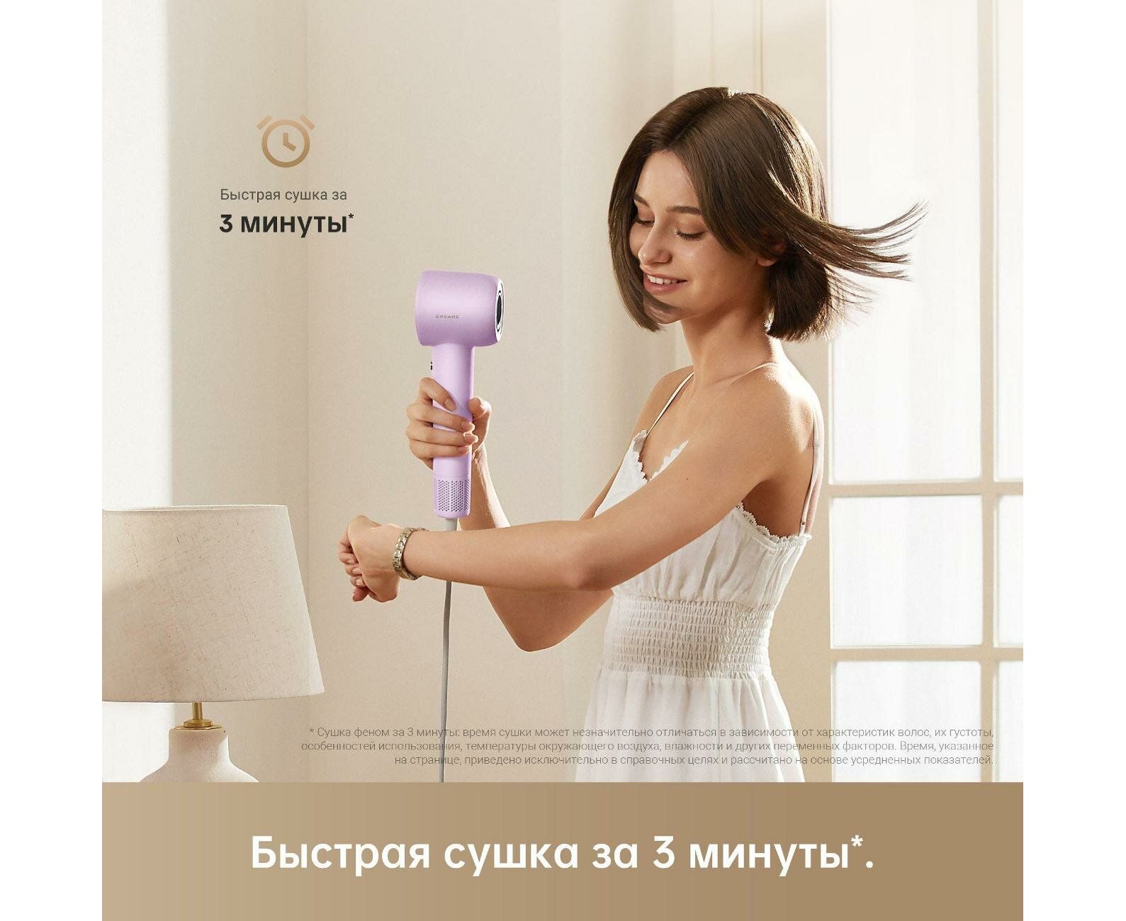Фен Dreame Hair Gleam Lilac отличается компактной и легкой конструкцией, что делает эксплуатацию удобной. Модель габаритами 25,5х8,2х7,6 см и весом 330 г выполнена в высокопрочном пластиковом корпусе со съемной защитной решеткой, благодаря чему достигается долгий срок службы.