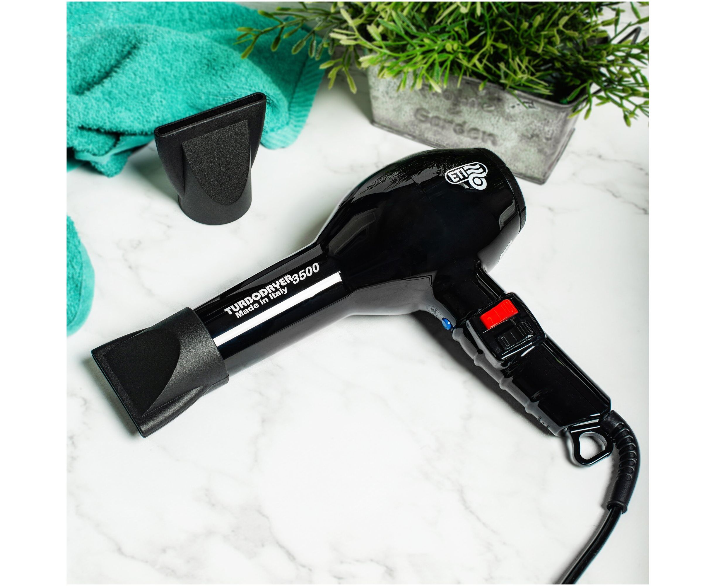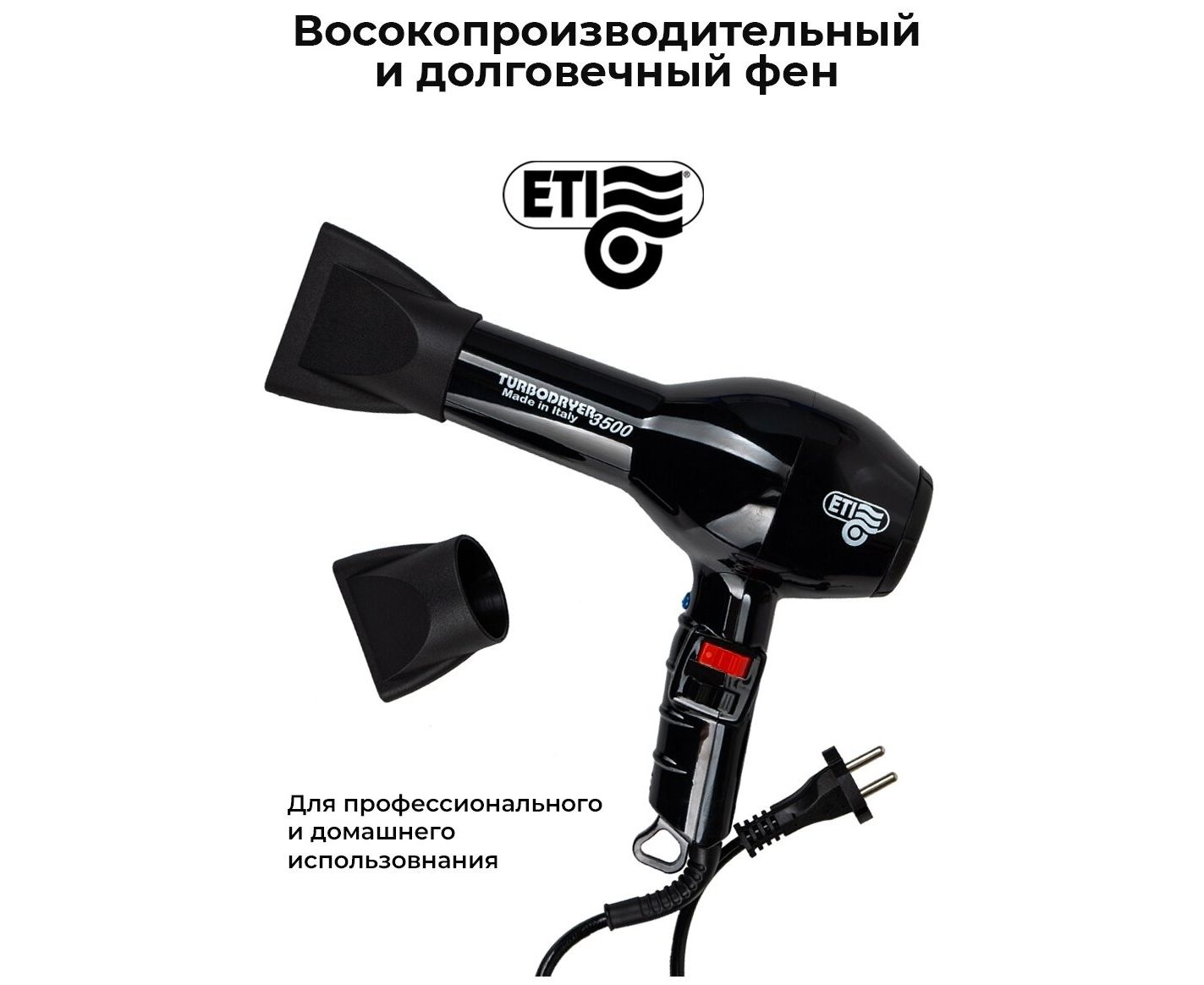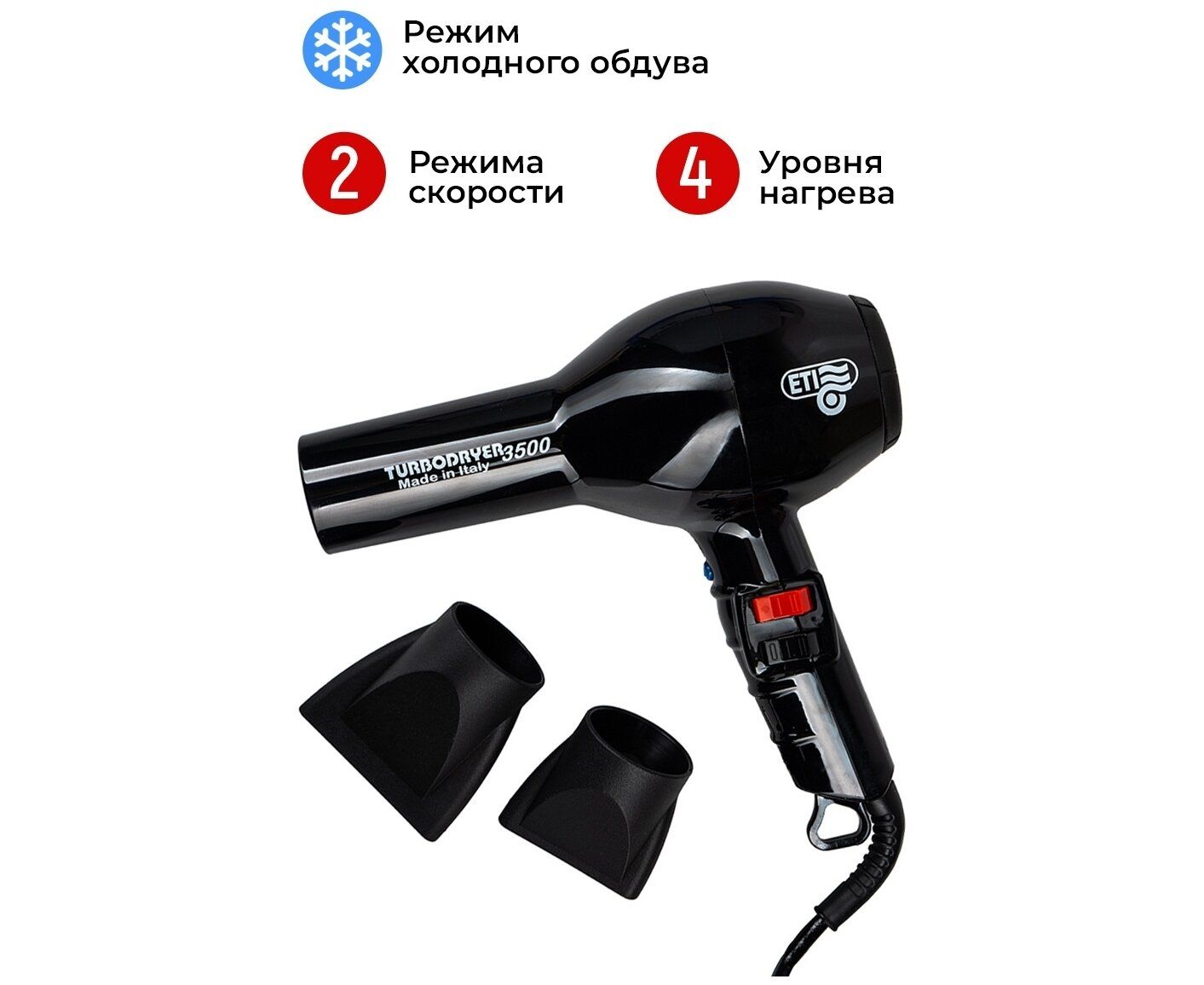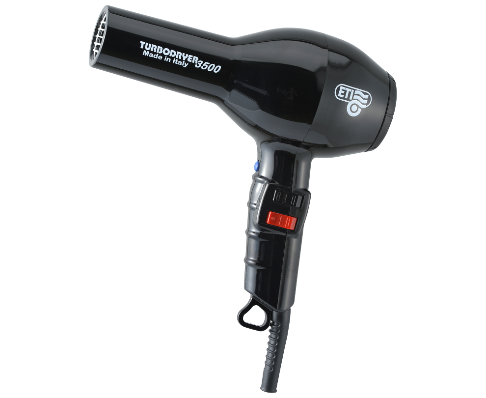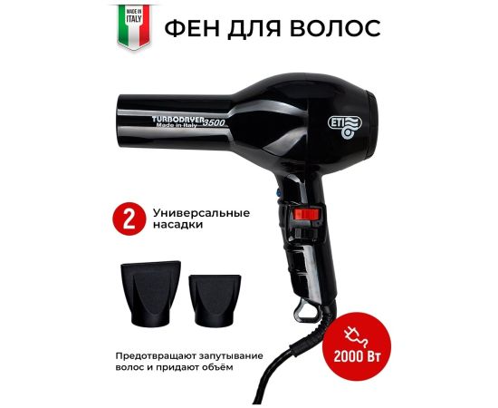 Профессиональный фен ETI Turbodryer 3500 для мастеров своего дела. Создан для ежедневной работы в условиях салона. Современный мощный мотор переменного тока с ресурсом 2500 часов работы не перегревается. Равномерно нагревает воздух и быстро переключается между температурами. Стильный фен для укладки отличается от других не только основными характеристиками, но и продуманным дизайном. Обдув воздуха равномерно распределяется по всей длине. Ручка комфортно ложится в руку. Положение кнопок позволяет удобно переключаться между 4 температурными режимами и двумя скоростями. Вес фена 595 грамм совершенно не ощущаются в руке, благодаря оптимальному распределению веса. Решетка воздухозаборника легко снимается и очищается. Длина провода 3 метра позволяет свободно перемещаться вокруг рабочего пространства. Мощность 2000 Вт. Мотор: АС. Скорость воздушного потока: 83 м куб/час. Шум: 70 дБ. Режим холодного обдува: есть. Керамическая решётка. Две насадки в комплекте. Сделано в Италии.