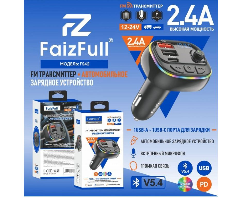 FM модулятор+АЗУ FaizFull FS42 12-24V 2,4A Bluetooth 5.4+EDR RGB встроенный микрофон