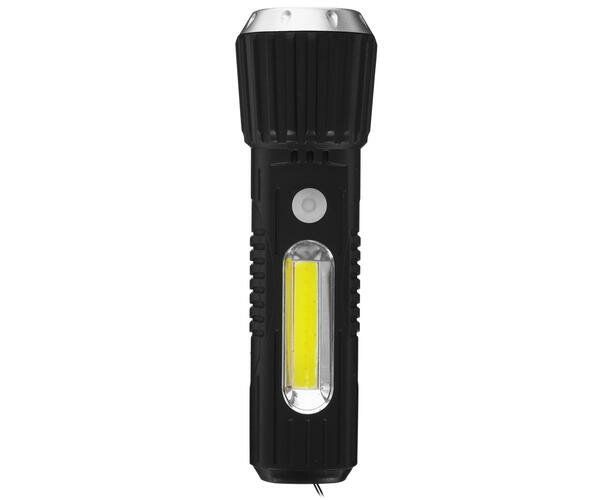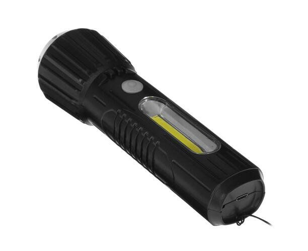 Ручной аккумуляторный фонарь КОСМОС 1Вт LED+2Вт COB, коллиматорная линза, Li-ion 18650 1000mAh, ABS-пластик, USB шнур KOS114Lit с защитой от дождя. Совмещает луч фонаря (направленный свет) и широкий свет (освещает широкое пространство с одной стороны). Источник питания: Li-ion аккумулятор 18650 3,7В 1000 мА/ч (встроенный).