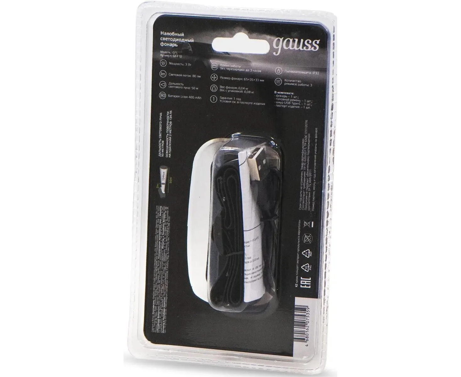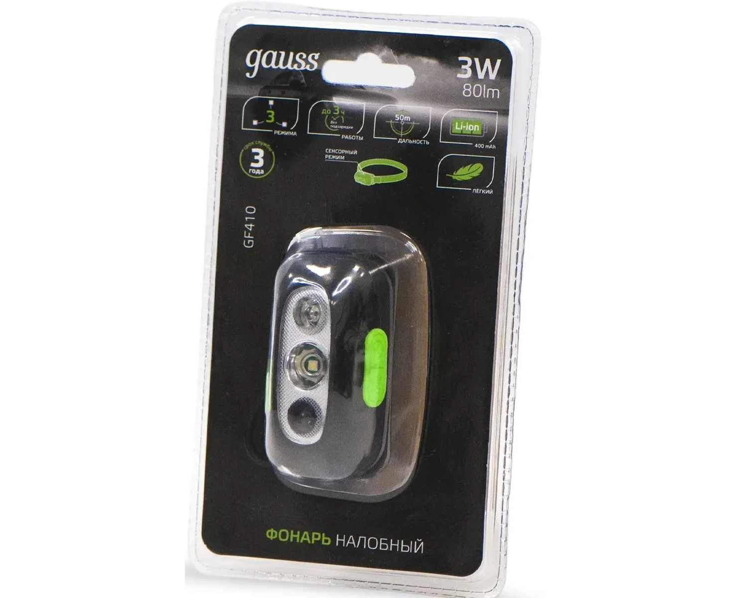 Фонарь налобный Gauss GFL410 черный 3Вт лам.:светодиод. встроенный аккумулятор (GF410)