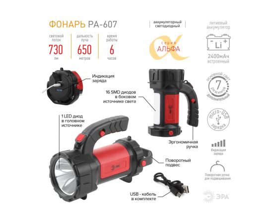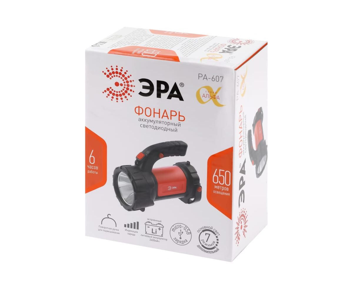 Фонарь отличается приятным дизайном и комфортом в использовании. В комплекте microUSB-кабель для подзарядки, имеется индикатор уровня заряда. При полном заряде работает непрерывно 6 часов. Благодаря емкому литиевому аккумулятору (2400 мАч) фонарь долго светит и мало весит. Удобно брать с собой, переносить, подвешивать и устанавливать на поверхность в качестве светильника. Идеальный вариант для кемпинга! Многофункциональность ЭРА PA-607 обеспечивается 7 режимами работы: основной свет, 100% яркости; основной свет, 50% яркости; мигание; боковой свет; боковой свет 50% яркости; боковой свет красный; боковой свет красный мигание.. Эргономичная ручка и поворотный подвес.