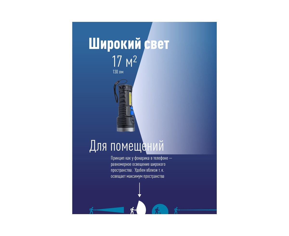 6.Дистанция освещения: 120 м. (луч)/17м2 (широкий свет, боковой светильник).