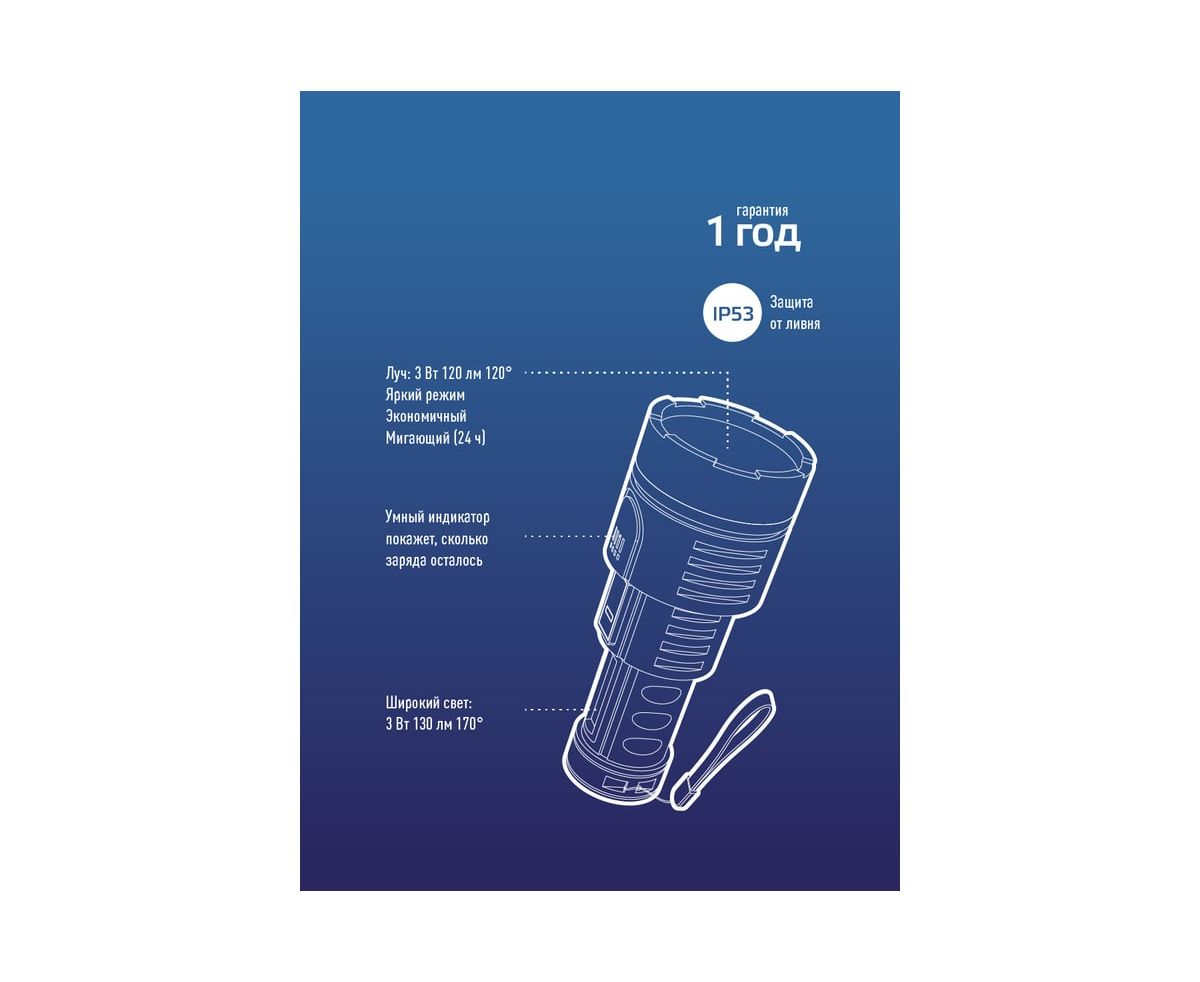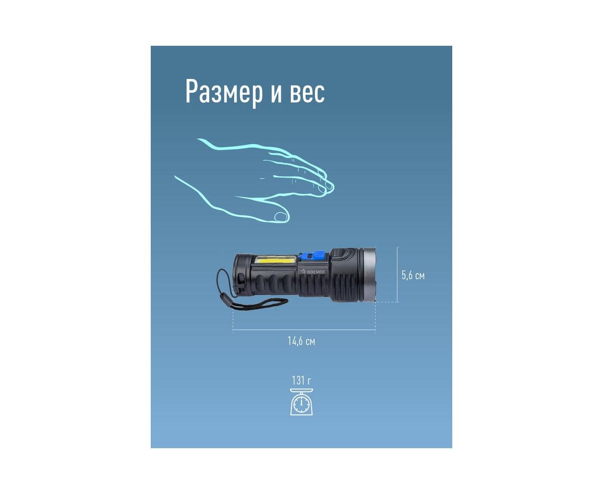 Ручной аккумуляторный фонарь КОСМОС 3Вт LED+3Вт COB, Li-ion 18650 1200mAh, ABS-пластик, индикатор, USB-шнур KOS115Lit с мощностью и свойствами прожектора в легком ручном корпусе. Совмещает луч фонаря (направленный свет) и широкий свет (освещает широкое пространство с одной стороны). Источник питания: Li-ion аккумулятор 18650 3,7В 1200 мА/ч (встроенный). Источник света: мощный луч 3Вт LED; мощный боковой светильник 3Вт COB LED.