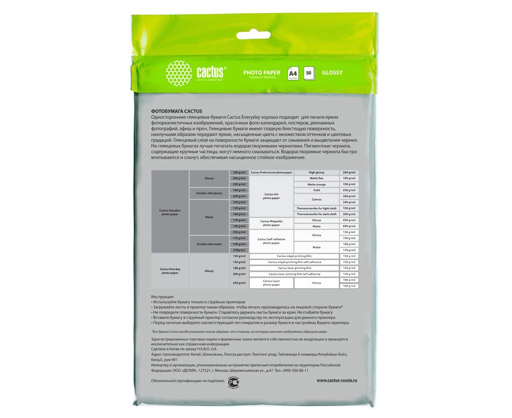 Фотобумага Cactus CS-GA415050 A4/150г/м2/50л/белый глянцевое для струйной печати