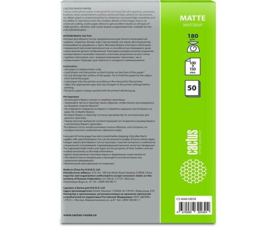 Фотобумага Cactus CS-MA618050 A6/180г/м2/50л/белый матовое для струйной печати