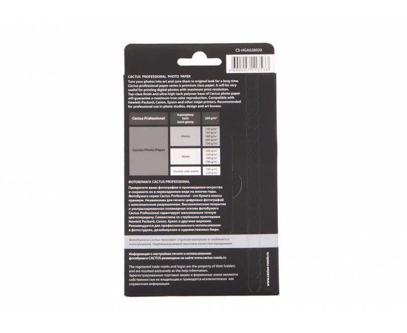 Фотобумага Cactus Prof CS-HGA626020 10x15/260г/м2/20л/белый глянцевое для струйной печати