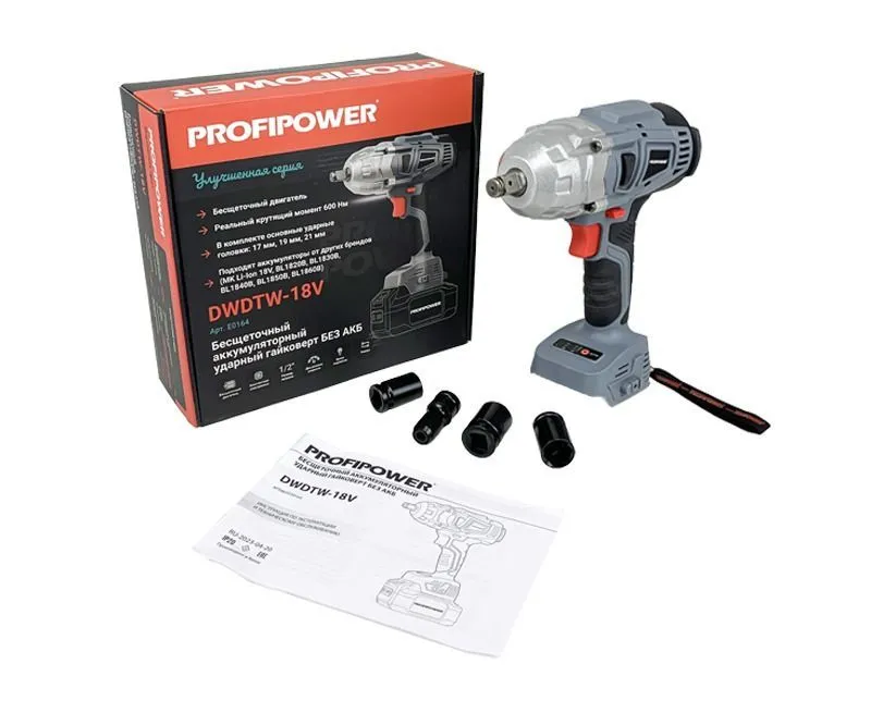 Аккумуляторный гайковерт бесщеточный ударный ProfiPower DWDTW-18V (без акб, 600Нм, набор головок 17/19/21мм, в коробке)