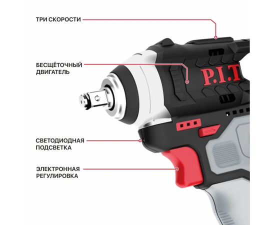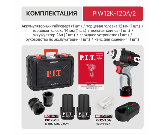Гайковерт P.I.T. PIW12K-120A/2 аккумуляторный 2 АКБ и ЗУ патрон квад.3/8"