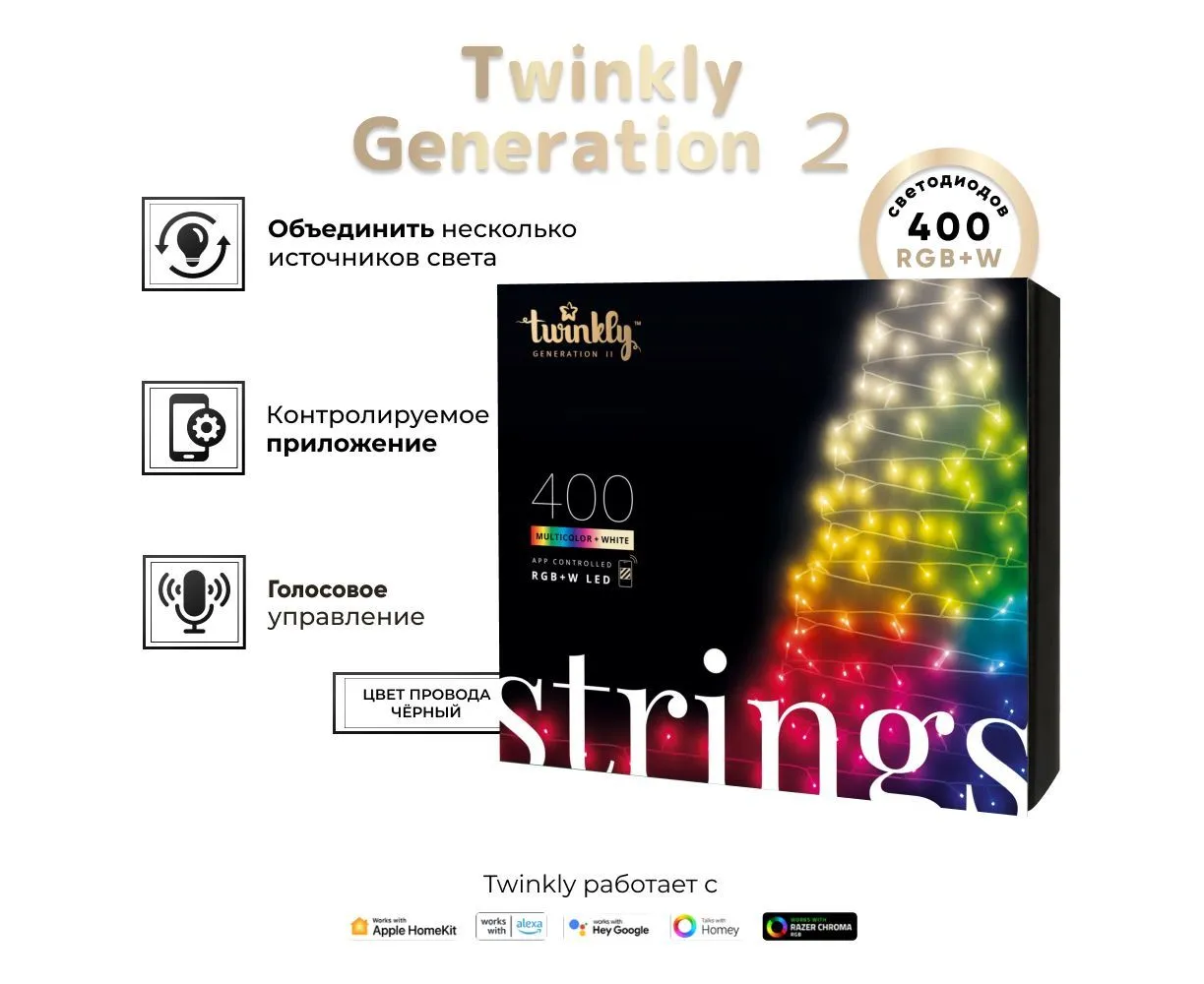 Гирлянда LED Twinkly Strings Special edition (Multicolor + White edition) - 400 шт. (32 м) RGB + W + BT + Wi-Fi (TWS400SPP-BEU) Generation II (чёрный провод)