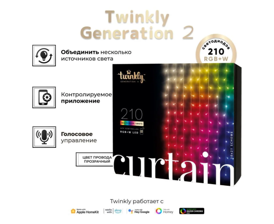Создайте невероятную атмосферу с Twinkly Curtain 210 – умной гирляндой, которая превращает любое пространство в световое шоу! 210 ярких RGB-светодиодов на гибкой занавесной конструкции управляются через приложение Twinkly на смартфоне (iOS/Android) или голосовыми ассистентами (Google Assistant, Alexa, Apple HomeKit).