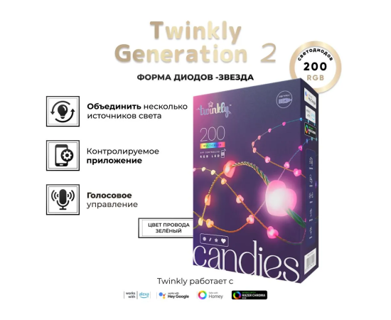 Гирлянда Twinkly Candies Hearts 200 диодов, в форме сердца, RGB, расстояние между лампами 6 см, зеленый провод, BT+WiFi, IP20, питание от USB-C