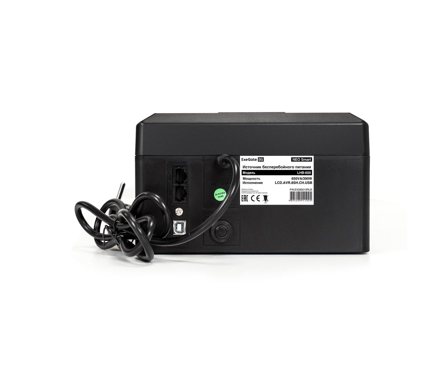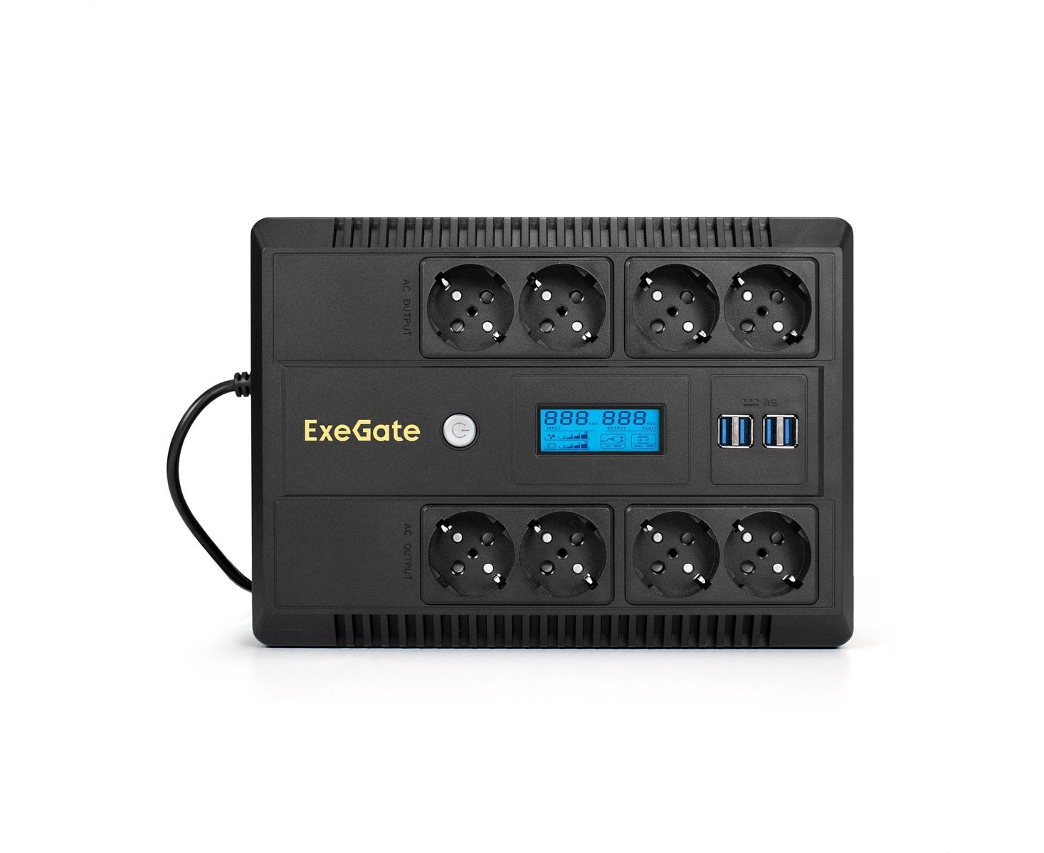 ИБП ExeGate Neo Smart LHB-650.LCD.AVR.8SH.CH.RJ.USB (EX295013RUS) 650VA/390W, LCD, AVR, 8*Schuko, RJ45/11, USB, 4*USB-порта для зарядки, Black
