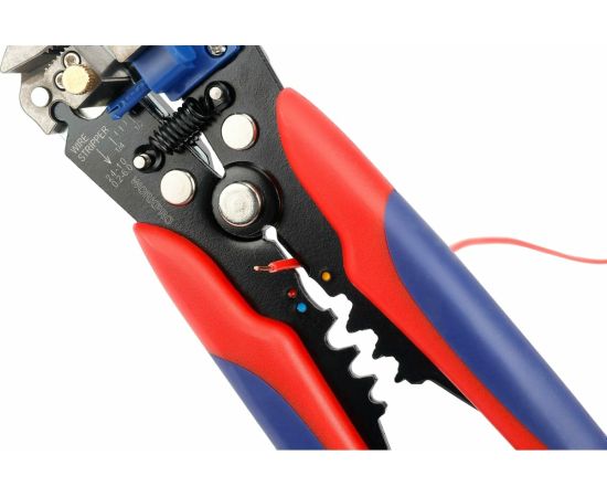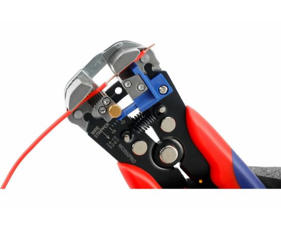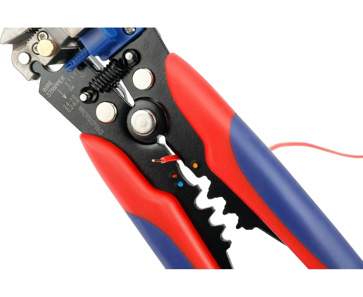 Инструмент для зачистки проводов WORKPRO 3в1 WP291007 имеет саморегулирующийся механизм: провод может быть зачищен путем регулировки точности открытия режущего лезвия, что идеально подходит для медных и алюминиевых кабелей от 10-24 AWG