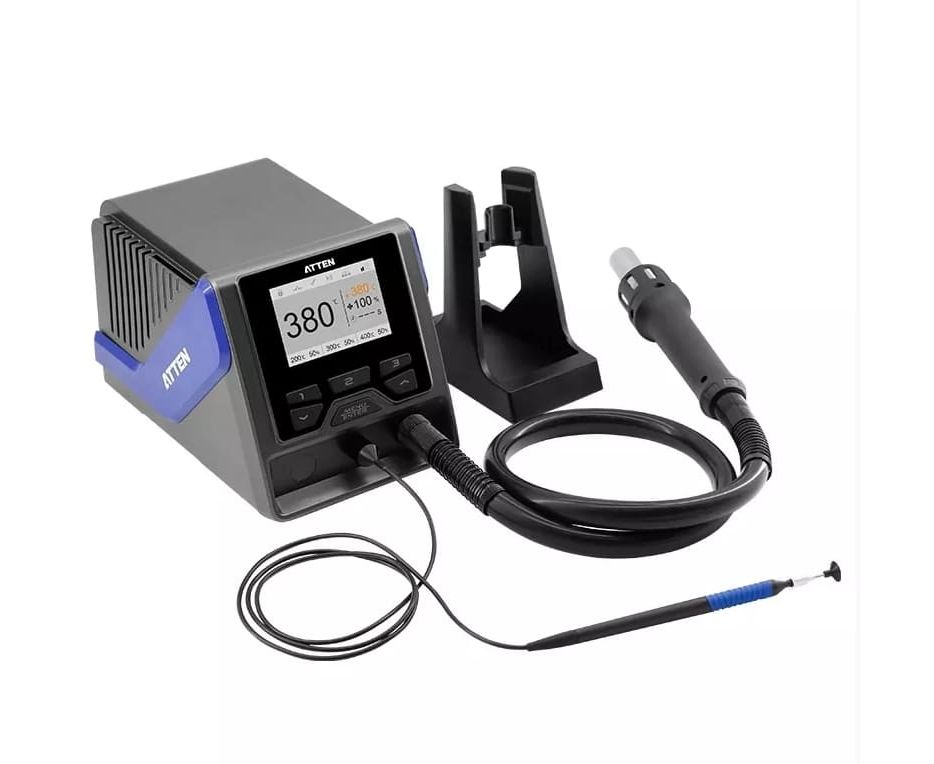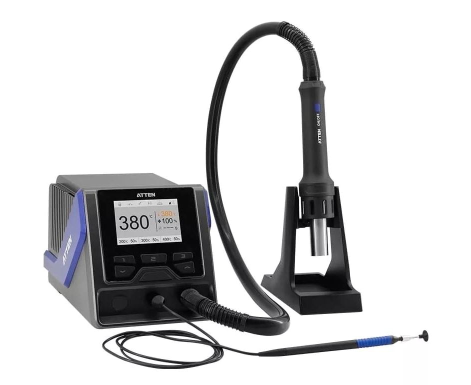 ATTEN GT-1028 интеллектуальная, высокомощная, термовоздушная ремонтно-паяльная станция для пайки горячим воздухом, подойдет для прогрева даже больших деталей, благодаря максимальной мощности в 1 300 Вт и точной обратной связи по температуре на выходе воздушного потока от нагревателя.