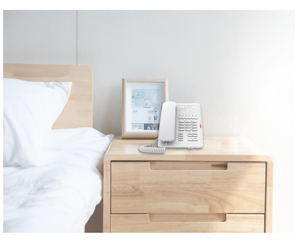 Лицевая панель может изменяться в соответствии с требованиями отеля. Имеет три режима работы: телефонная трубка/спикерфон/гарнитура.