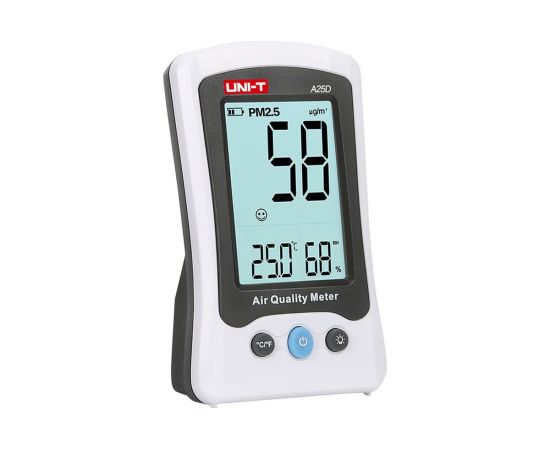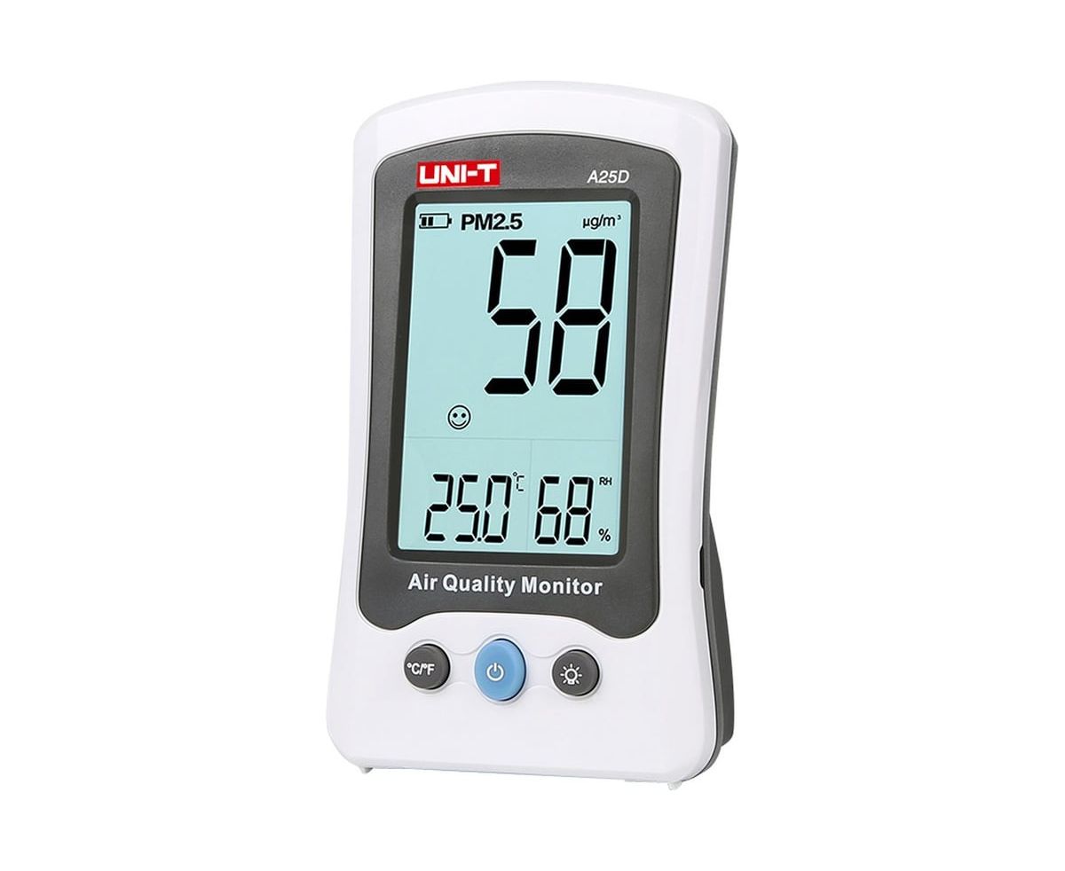 Измеритель качества воздуха UNI-T A25D позволяет анализировать содержание в воздухе частиц размером 2.5 мкм и менее. Измерения должны производиться при температуре 18 … 28°C и относительной влажности 45 … 75%. Также позволяет измерить содержание в воздухе формальдегида, температуру и влажность. Есть цветовая сигнализация о превышении заданных параметров.