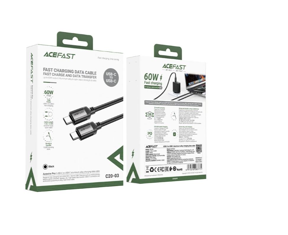 Дата-кабель ACEFAST AF-C20-03-BK USB-C To USB-C Aluminum Alloy Charging Data Cable Black