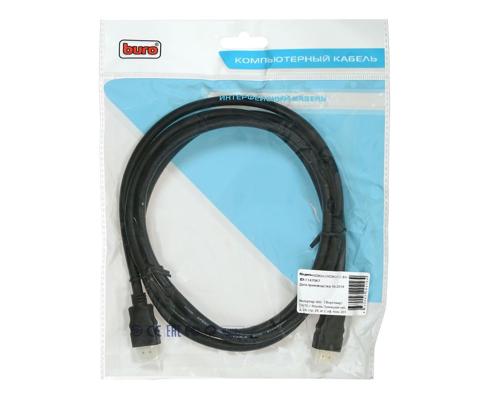 Кабель аудио-видео Buro HDM 2.0 HDMI (m)/HDMI (m) 1.8м. Позолоченные контакты черный (BHP RET HDMI18-2)