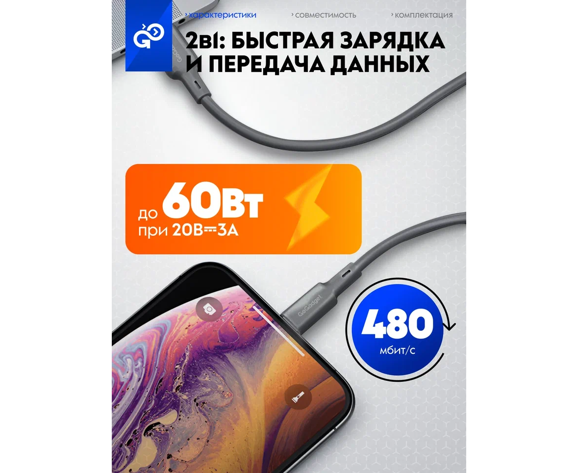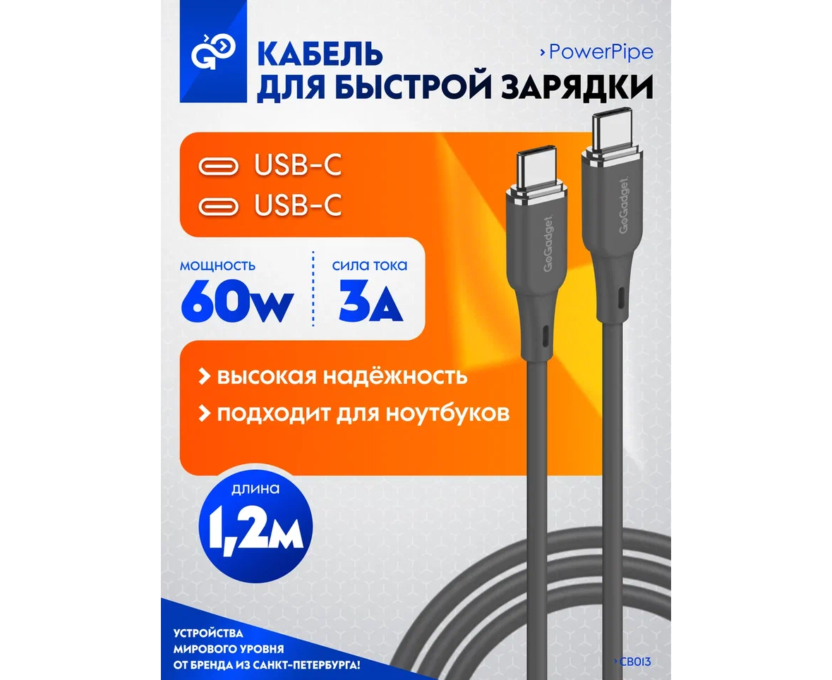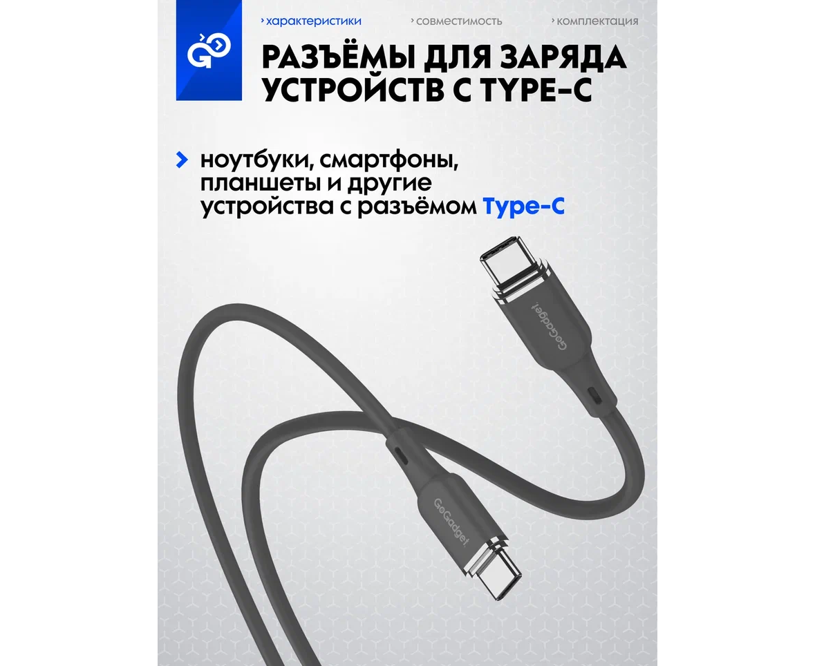 Кабель GoGadget USB-C/USB-С, 60Вт, 1,2 м Силикон, Темно-серый