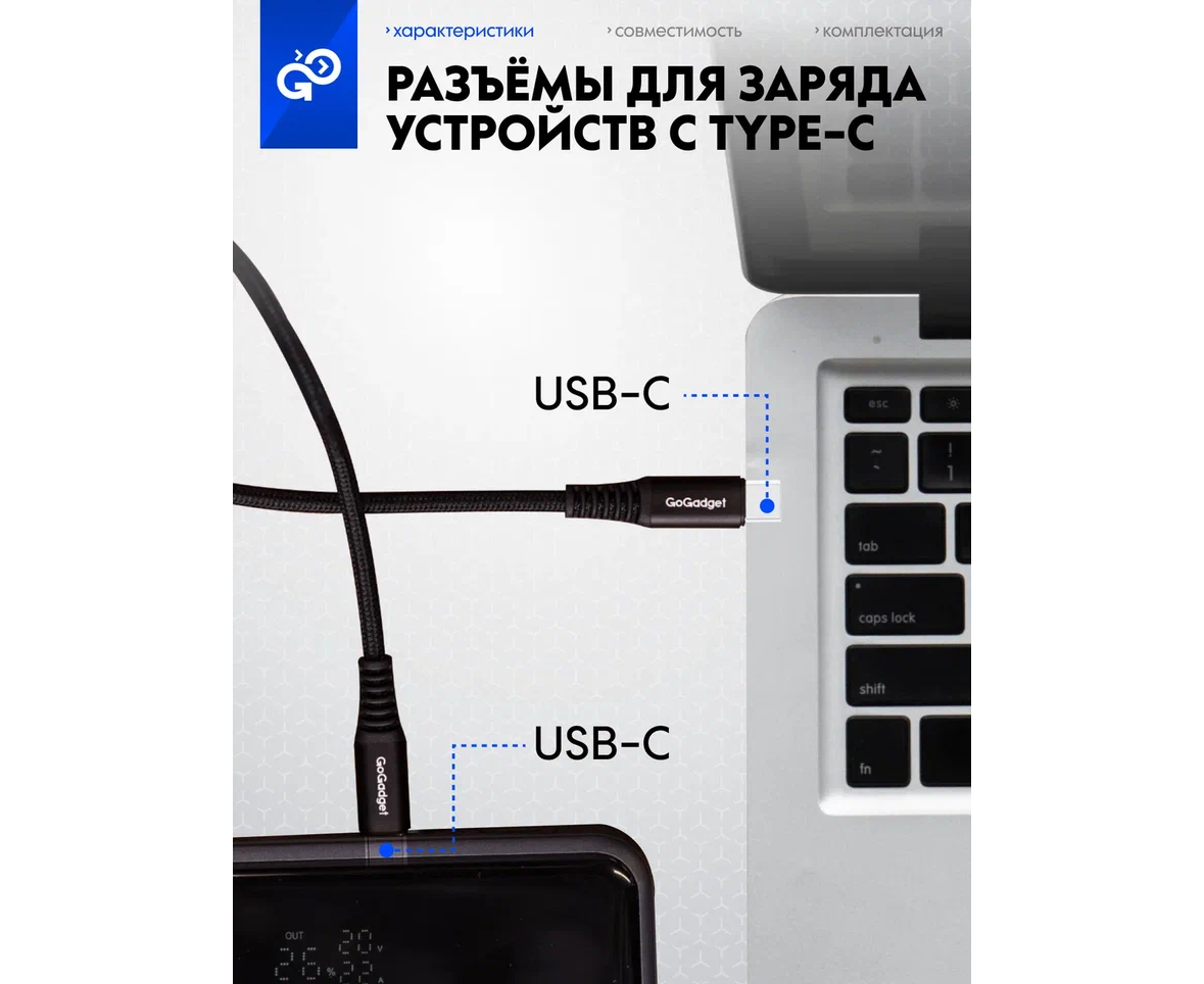 Кабель GoGadget USB-C/USB-С, до 60Вт, 3А, 1,2 м Нейлон, Черный