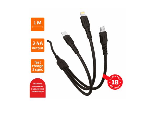Технологичный кабель премиум класса повышенной функциональности объединяет 3 самых популярных разъема: Micro-USB, Lightning и Type C