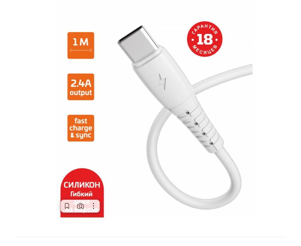 Пропускная способность кабеля 2.4А обеспечивает поддержку быстрой зарядки (FAST CHARGE).