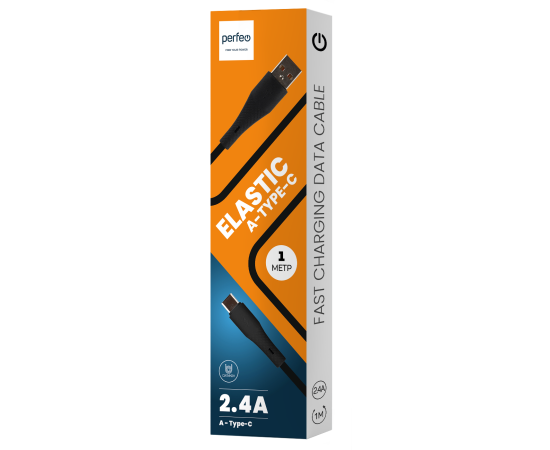Кабель PERFEO USB A вилка - C вилка, 2.4A, черный, силикон, длина 1 м., ELASTIC (U4718)