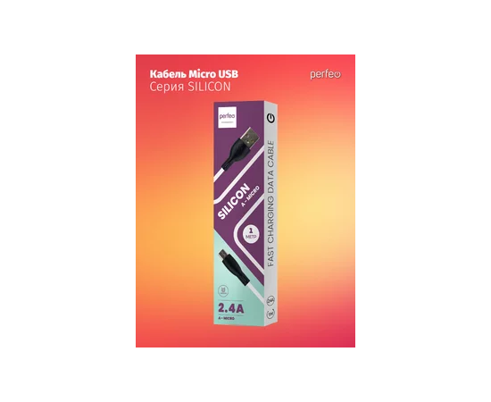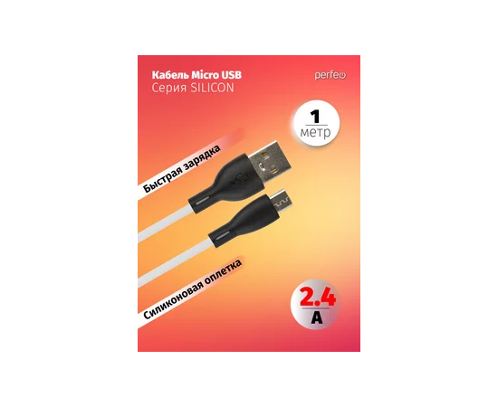 Кабель PERFEO USB A вилка - Micro USB вилка, 2.4A, белый, силикон, длина 1 м., SILICON (U4026)