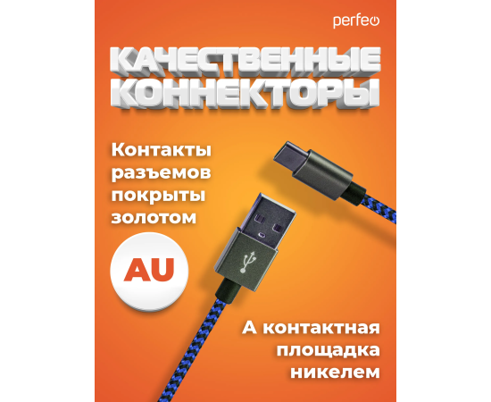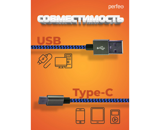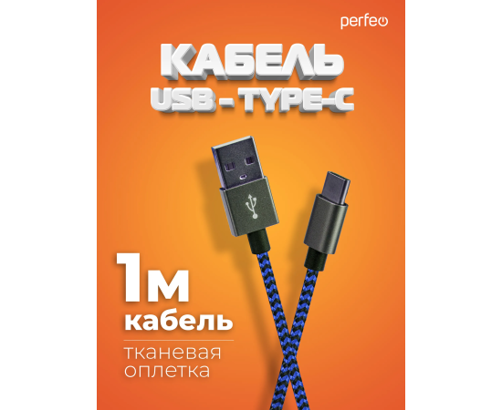Кабель PERFEO USB A вилка - Type-C вилка, черно-синий, длина 1 м. (U4903)