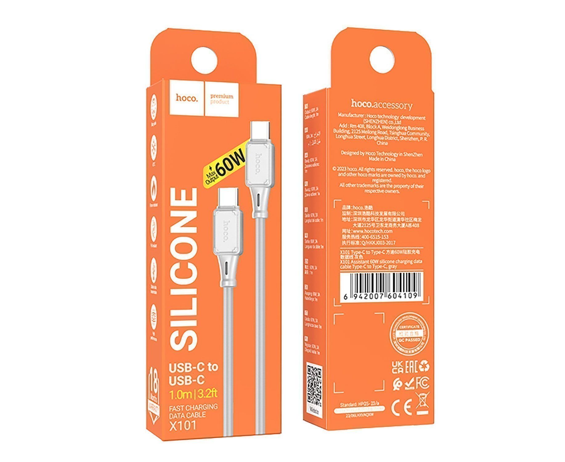 Кабель Type-C - Type-C Hoco X101 Assistant PD 60W 100см 3A (gray) (240325)