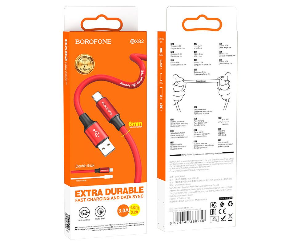 Кабель USB - Type-C Borofone BX82 Bountiful, 1.0м, круглый, 3.0A, силикон, цвет: красный (1/33/330)