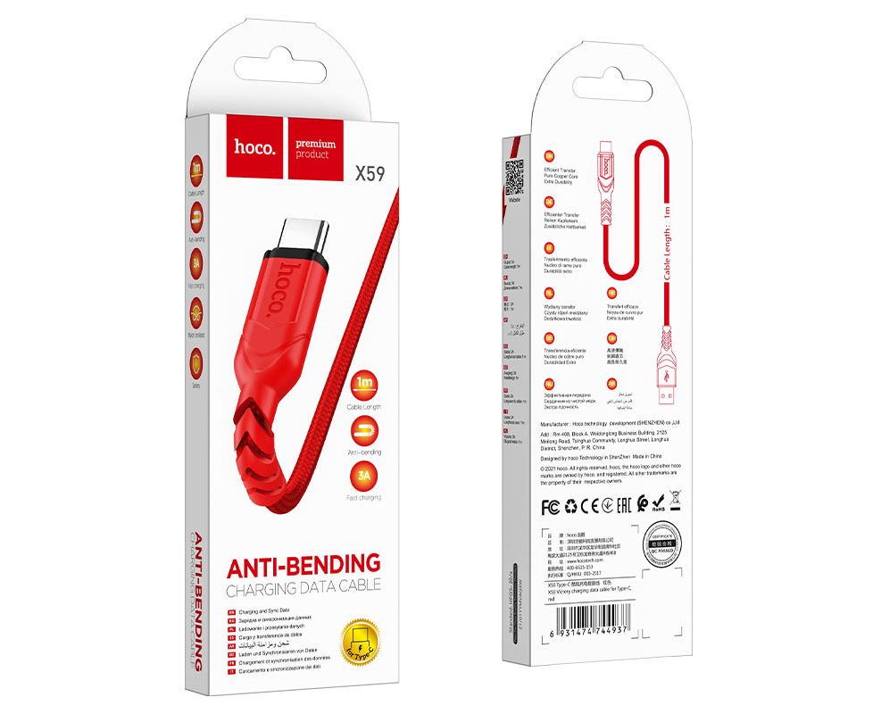 Кабель USB - Type-C HOCO X59 Victory, 1.0м, круглый, 3,0А, ткань, цвет: красный(1/30/300)