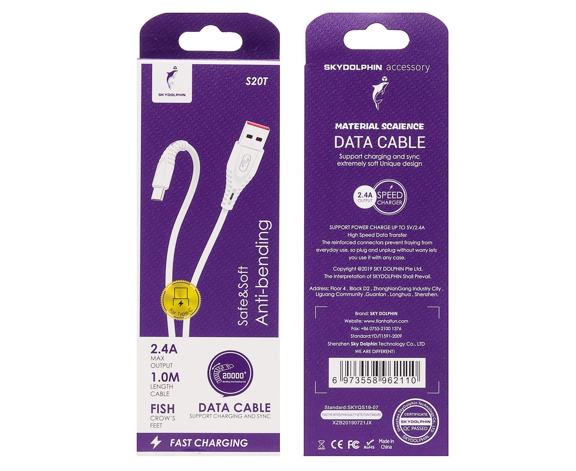 Кабель USB - Type-C SKYDOLPHIN S20T 100см 2,4A (white) (206491)