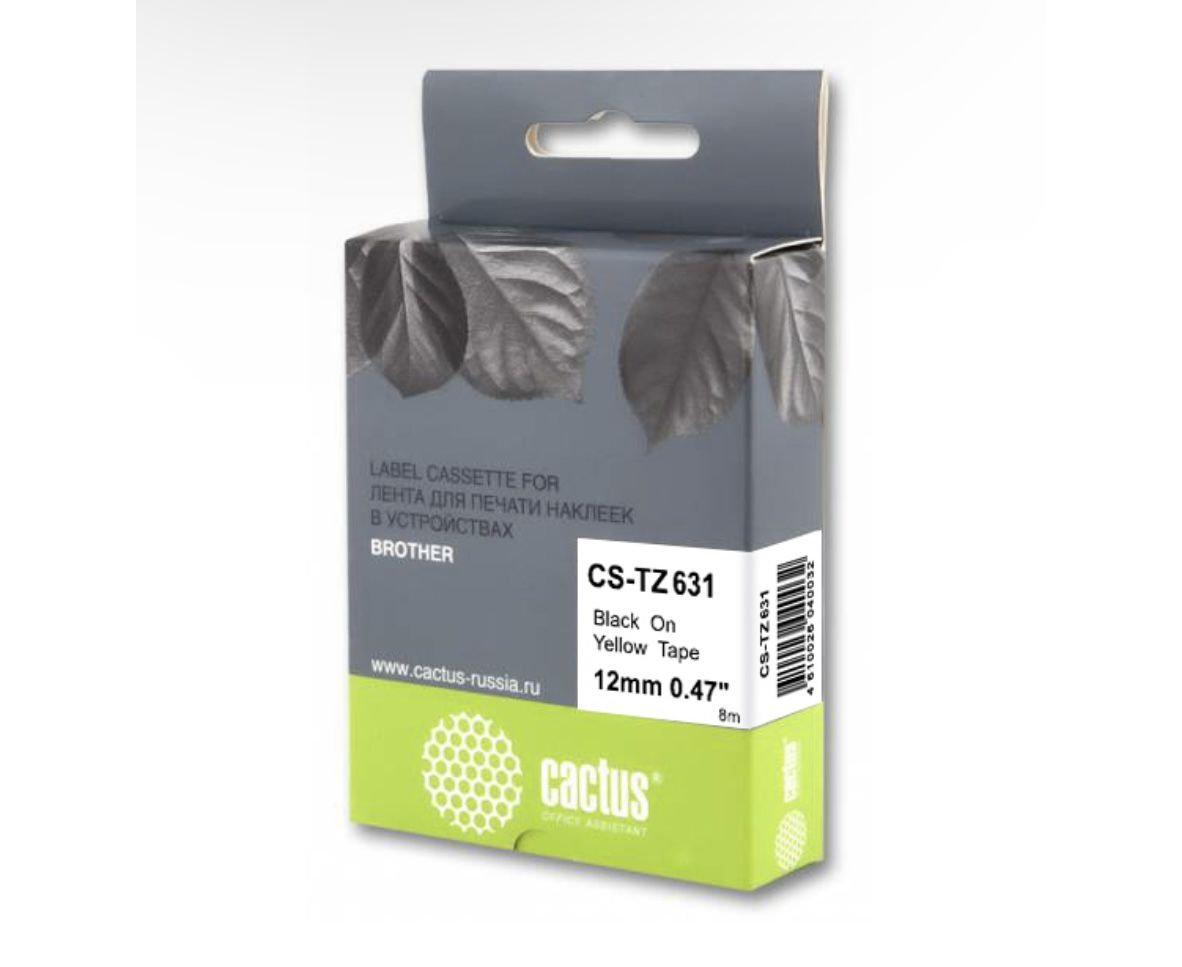 Картридж ленточный Cactus CS-TZ631: черный текст на желтом фоне, ширина ленты 12 мм, длина 8 м. Ламинированная лента для печати наклеек подходит для маркировки любых предметов, от кабеля, трубопровода и оборудования, до папок и полок. Наклейки обладают хорошей устойчивостью к экстремальным температурам, трению, воздействию химикатов и солнечного света. Можно использовать на открытом воздухе.