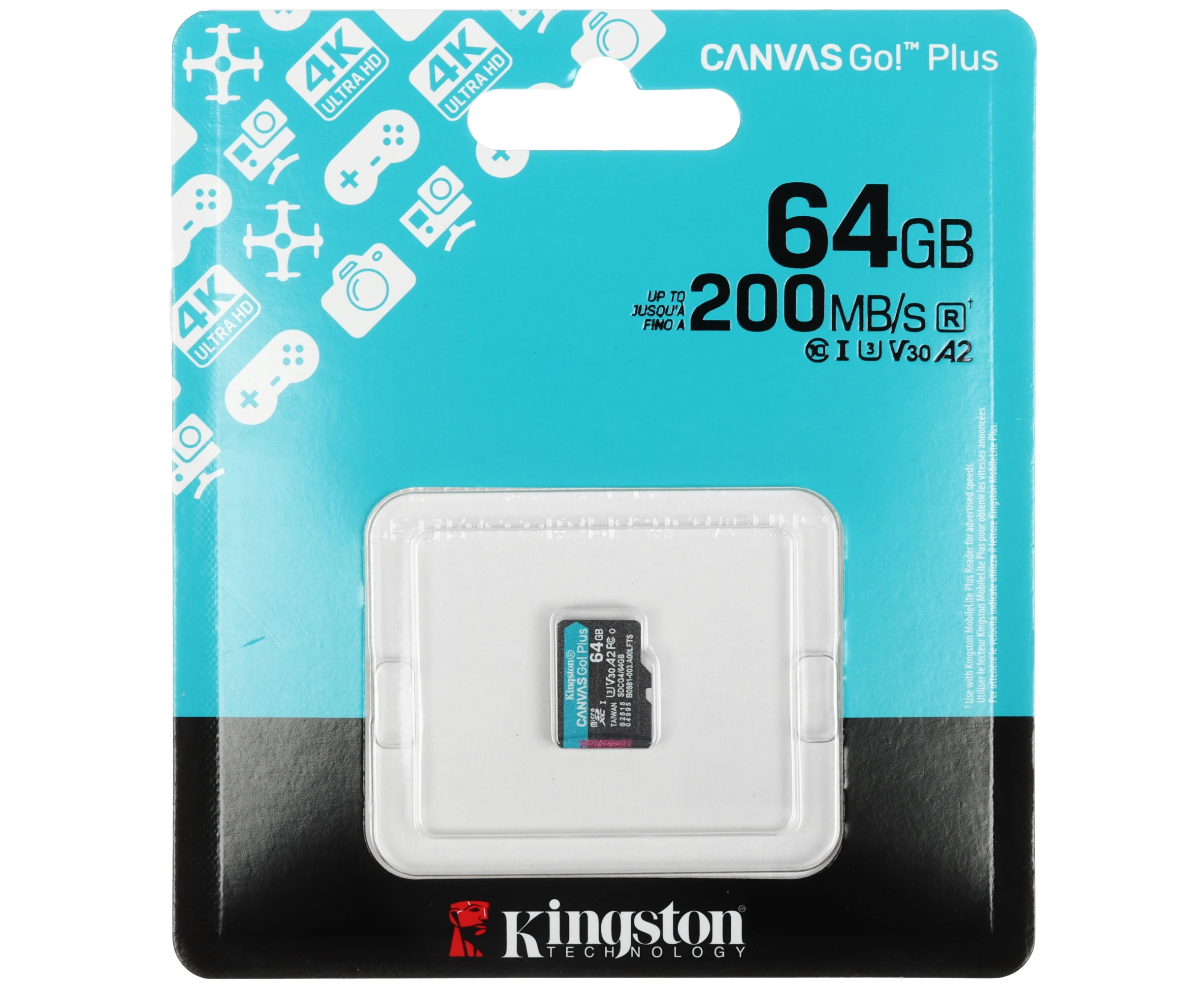 Карта памяти Kingston Canvas Go! Plus microSDXC 64 ГБ [SDCG4/64GBSP] соответствует классам скорости A2, Class 10, UHS Class 3 и Video Class 30. Изделие предназначено для смартфонов, фотокамер и других устройств.