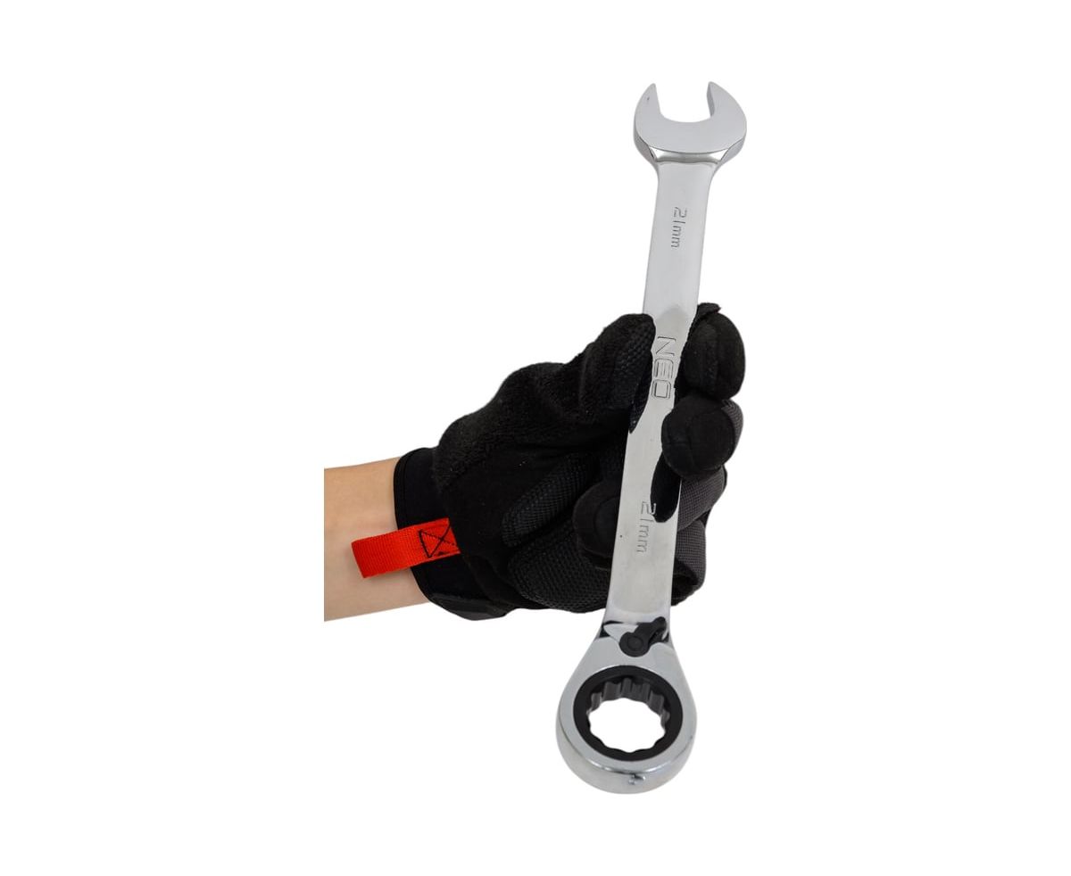 Комбинированный ключ NEO с трещоткой, 21 мм 09-333 оснащен трещоткой с 72 зубцами. Ключ обеспечивает быструю и точную работу. Высокосортная хромованадиевая сталь гарантирует долголетнюю прочность.