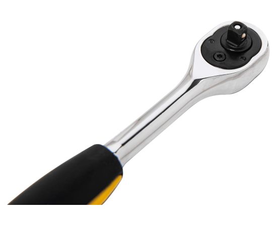 Ключ-трещотка упрощает затягивание крепежа в условиях ограниченного пространства. Ключ выполнен из качественной хромомолибденовой стали, что обеспечивает прочность и долговечность. Эргономичная двухкомпонентная ручка служит для удобного хвата и комфортной работы. Храповая головка с 45 зубьями с функцией реверса позволяет вращать ключ в обе стороны. Инструмент оснащён механизмом для быстрого сброса насадок.