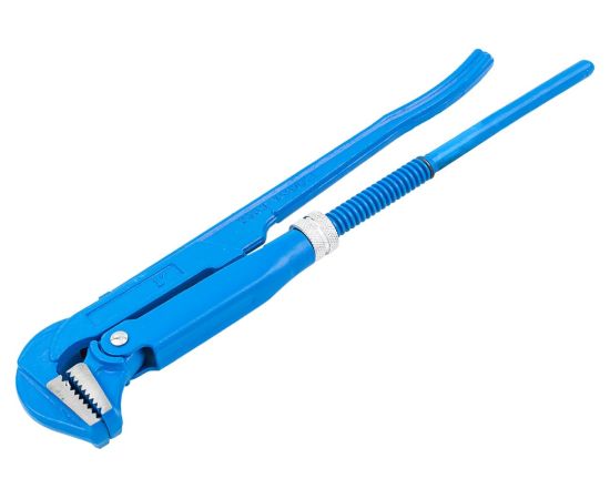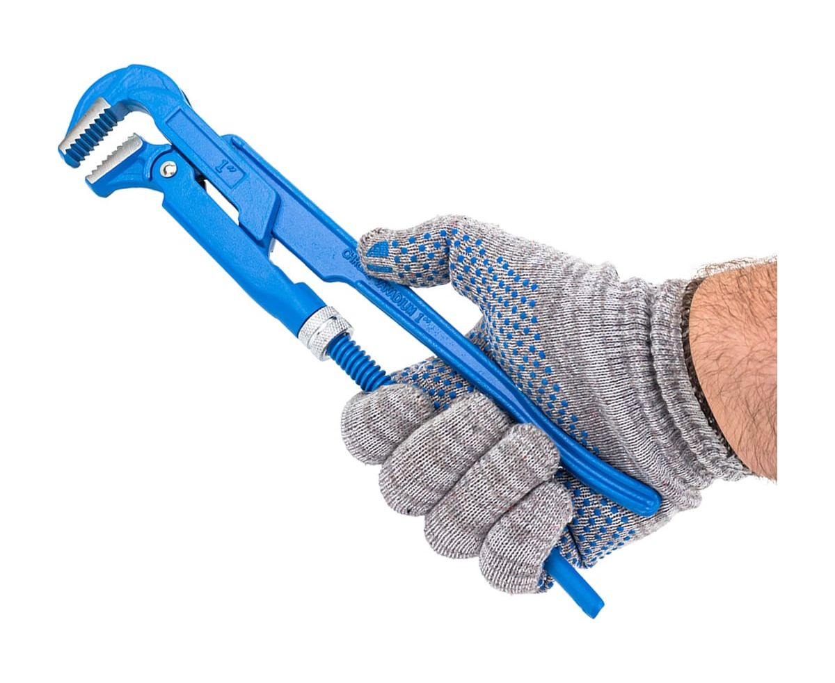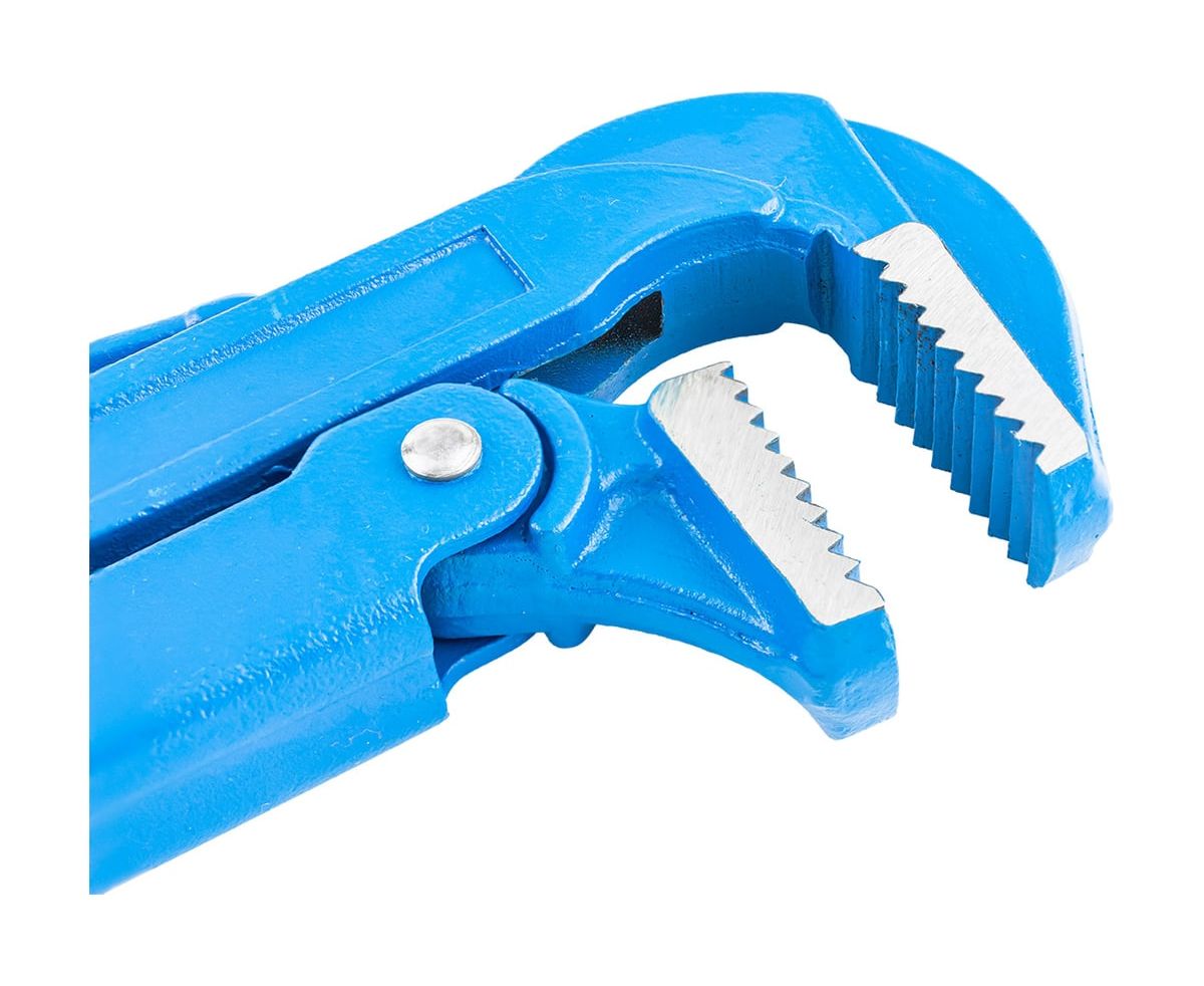 Удобство использования: Губки ключа расположены под углом к рукояткам, что повышает комфорт работы. Насечки на губках предотвращают проскальзывание деталей и обеспечивают надежное удержание предметов сложной формы.
