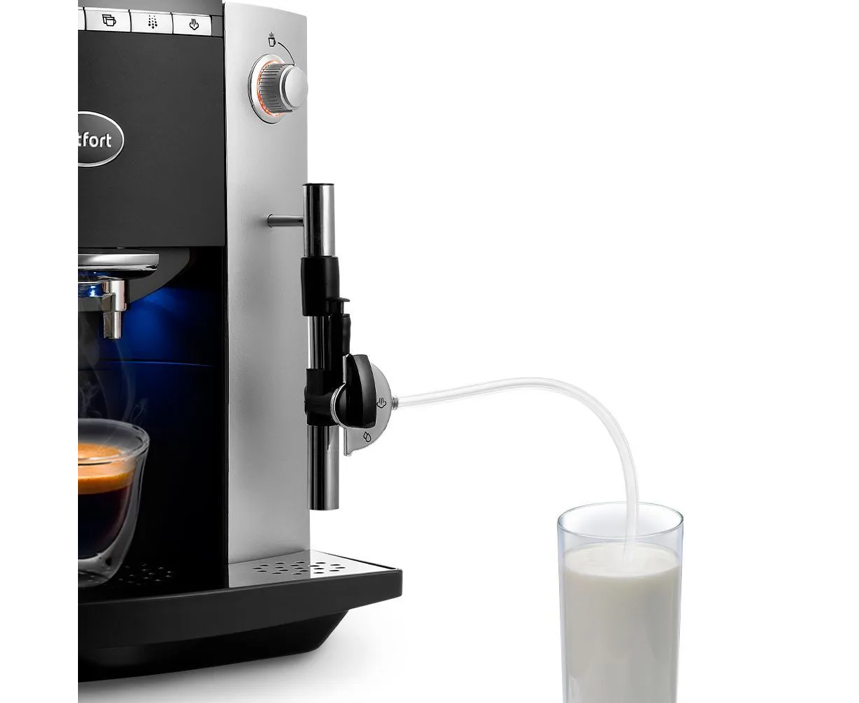 Молочную пенку кофемашина может приготовить автоматически. Для этого предусмотрены капучинатор и трубка забора молока, которую погружают в ёмкость с холодным молоком.