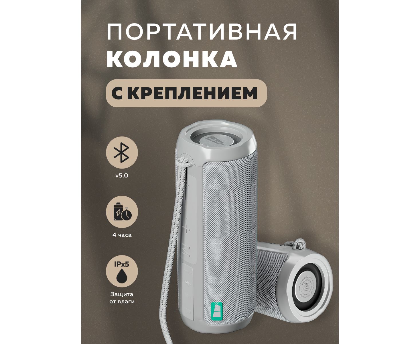 Материал: ABS-пластик, ткань. Тип беспроводного соединения: Bluetooth 5.1. Емкость аккумулятора: 1800 mAh Время работы в режиме воспроизведения: 4 часа. Время зарядки: 3 часа. Количество динамиков: 2. Размер динамиков: 45 мм*2. Мощность динамиков: 5 Вт*2 Тип подключения: Bluetooth, micro USB, USB, AUX 3.5 мм, картридер, FM приемник. Разъемы: mini Jack 3.5 мм, micro USB, USB 2.0, micro SD. Водонепроницаемость IPx5 Комплектация: Bluetooth колонка, micro USB кабель, многофункциональная бандана, инструкция, буклет. Цвета: Black, Blue, Red, Grey.