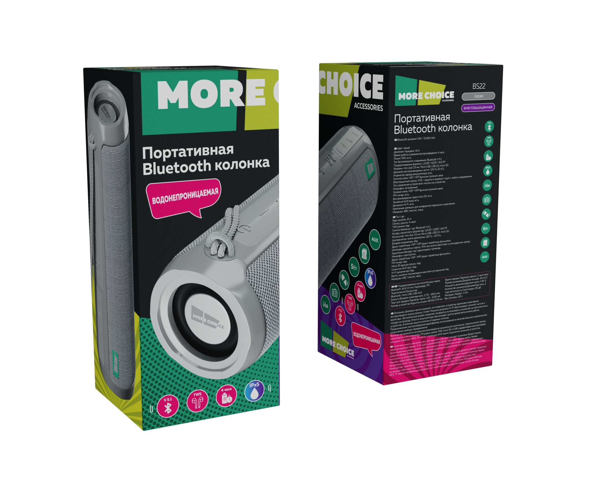 Колонка Bluetooth 5.1 2*5W 1800mAh More Choice BS22 (Grey)
