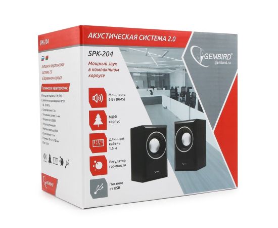 Gembird SPK-204, МДФ, черный ,2х3 Вт, регулятор громкости, USB-питание
