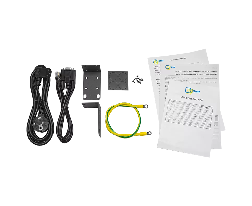 Комплект поставки Коммутатор; Кабель питания; Разъем DC питания; Консольный кабель; Крепления в стойку (2 шт.); Резиновые ножки (4 шт.); Набор болтов; Руководство по установке; Гарантийный талон.