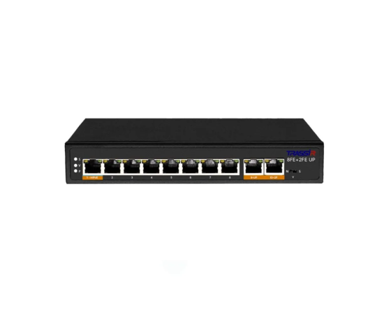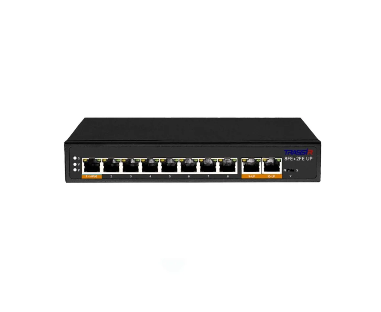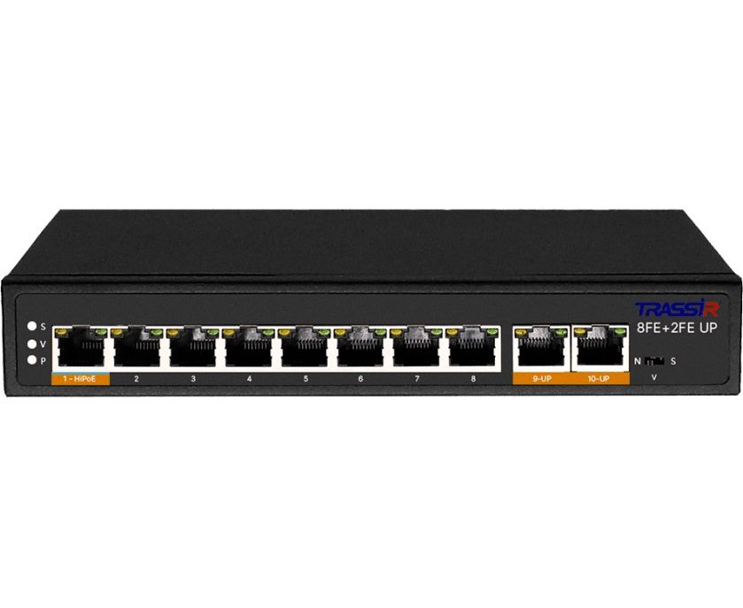 Неуправляемый РоЕ-коммутатор TRASSIR TR-NS1110-120-8PoE оборудован восемью PoE-портами RJ-45 Fast Ethernet, двумя uplink-портами RJ-45.