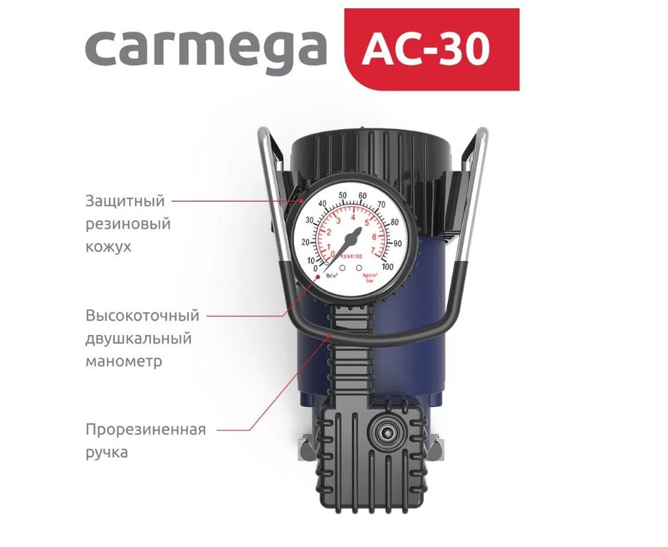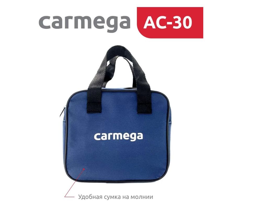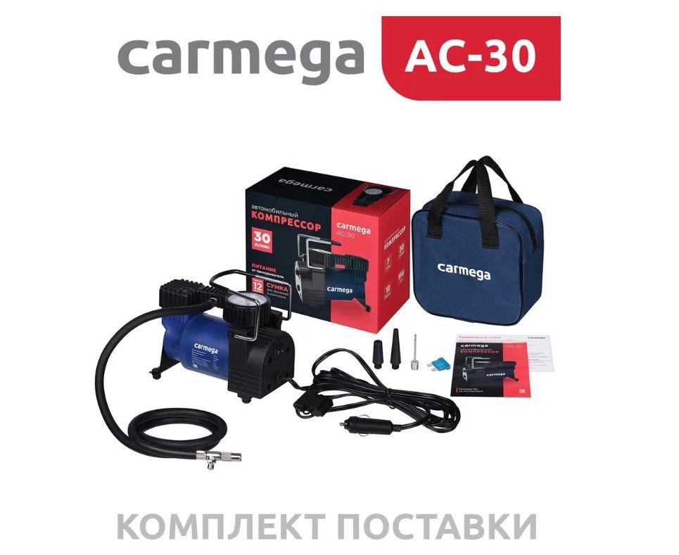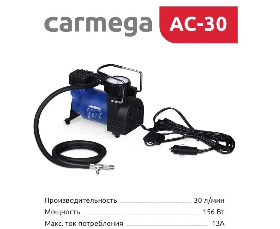 Надежный компрессор CARMEGA AC-30 с легкостью накачает не только колесо Вашего автомобиля, но и поможет подкачать мяч, резиновую лодку или матрас. Для этого в комплекте предусмотрен набор переходников.