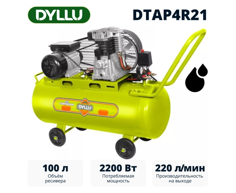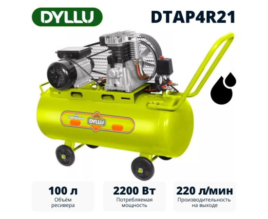 DYLLU DTAP4R21 - масляный компрессор с ременным приводом, предназначенный для получения сжатого воздуха с давлением в ресивере 8 бар в условиях домашней мастерской или гаража (DIY).