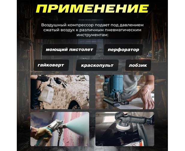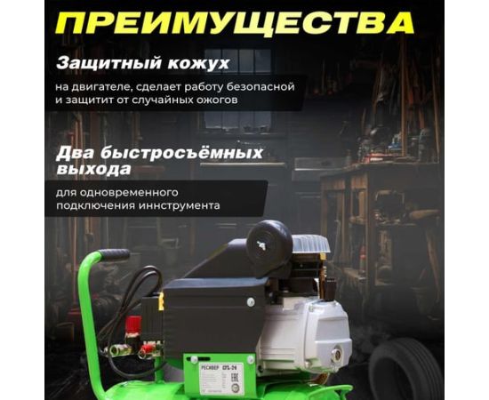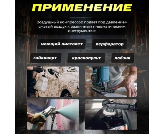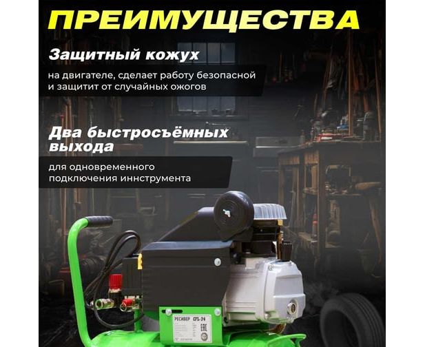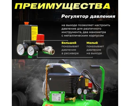 Наличие двух быстросъемных выходов позволяет подключить одновременно два инструмента. Регулятор давления обеспечивает безопасную работу.