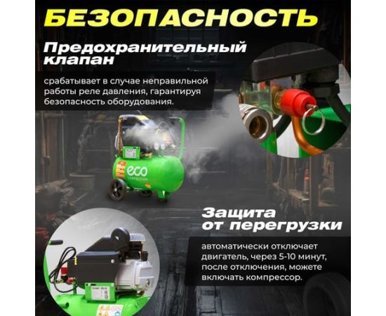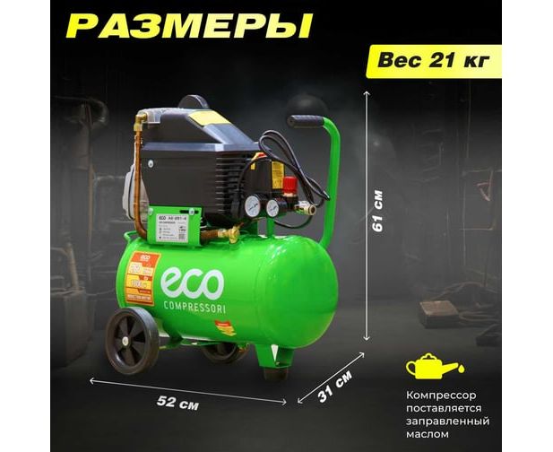 Компрессор ECO AE-251-4 предназначен для сжатия воздуха и подачи его в нужном направлении. Подходит для бытового использования в гараже или на даче.